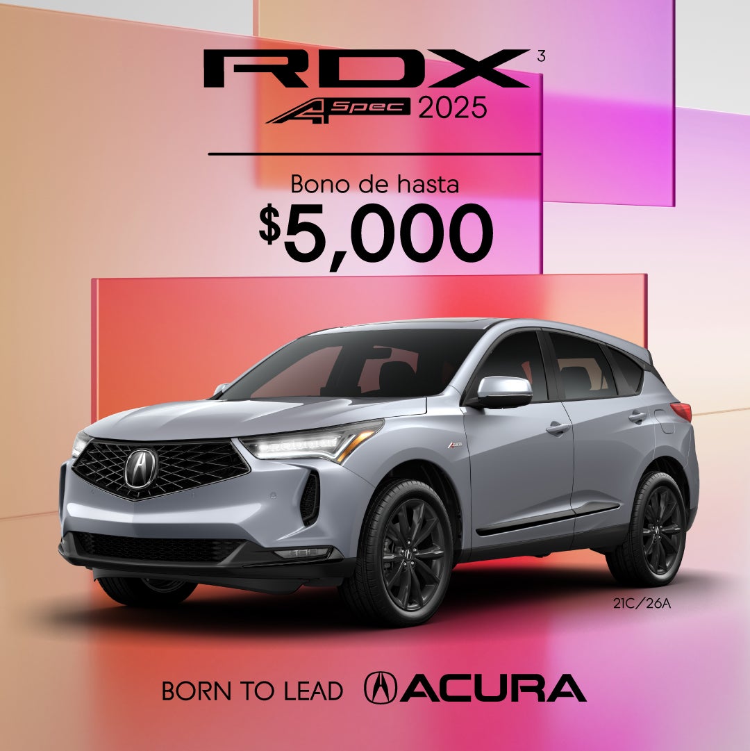 *Acura Platinum Program aplica a todos los modelos nuevos de Acura, durante la garantía básica de 4 años o 50,000 millas, lo primero que ocurra. (1) Bono de $2,000 aplica a todos los modelos RDX 2025. Ejemplo: RDX Technology 2025 modelo TC2H5, con precio regular de $68,168, menos bono de $2,000, precio especial de $66,168. (2) Acura Integra 2024 modelo DE4H2RJW : Precio regular $49,790. Bono de $5,890. Precio especial desde: $43,900. (3) Acura RDX A-SPEC 2025 modelo TC2H6SKNW Precio regular $72,690. Bono de $2,790. Precio especial $69,900. (4) Acura MDX Luxury 2025 Modelo YD9H3SJNW : Precio regular $76,987. Bono de $6,988. Precio especial $69,999. (5) Acura ADX Luxury 2025. Precio de Venta: $54,900. **Cobertura de por vida en el powertrain (motor, transmisión y diferencial) aplica a todas las unidades Acura nuevas vendidas a partir del 6 de abril del 2024, con 6,000 millas o menos. Aplica a modelos nuevos vendidos, no importa el año. Cobertura incluye hasta $100 para asistencia en la carretera solo para averías mecánicas relacionadas al "powertrain". Cliente debe realizar todos los mantenimientos, según recomendaciones del fabricante. El contrato de avería mecánica no es transferible ni cancelable (aplica solo al dueño original). Una vez entre en vigor el beneficio, todo arreglo de avería conlleva deducible de $200, independientemente del costo original que conlleve dicho arreglo. Ofertas no pueden combinarse con otras ofertas o descuentos y están sujetas a aprobación de crédito según parámetros de la institución financiera. Ofertas no incluyen gastos de originación, mantenimiento, ni ningún tipo de seguro. Rodaje en carretera (MPG) basado en estimados de millaje del EPA y puede variar de acuerdo con las condiciones de manejo y de la carretera. Ofertas válidas del 1 de junio de 2025 al 30 de junio de 2025 o mientras dure el inventario en dealers Flagship Acura en San Juan y Ponce.